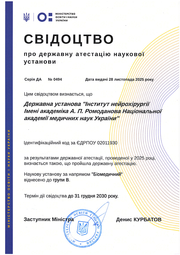 Dear friends, We sincerely congratulate you on the Independence Day of Ukraine! This holiday reminds us of the immense value of freedom, the courage of our people, and the resilience of the Ukrainian spirit. May pride in Ukraine live in every heart, and may peace, prosperity, and harmony reign in every family. We wish you strength, endurance, and faith in the bright future of our state. Glory to Ukraine! 22.08.2025. A master class “Endoscopic Spine Surgery” will be held in October 2025For the first time in Ukraine, in October 2025, an international master class “Endoscopic Spine Surgery” will take place. 20.08.2025. Announcement of a competition for the vacant position of Director of the State Institution “Romodanov Neurosurgery Institute of the NAMS of Ukraine”In accordance with the Law of Ukraine “On Scientific and Scientific-Technical Activities,” the Statute of the National Academy of Medical Sciences of Ukraine (hereinafter – NAMS of Ukraine), approved by the General Assembly of NAMS of Ukraine on May 16, 2023 (registered by the Ministry of Justice of Ukraine by Order No. 3467/5 of September 18, 2023), and Resolution of the Bureau of the Presidium of the National Academy of Medical Sciences of Ukraine No. 6/1 of August 19, 2025, the Presidium of NAMS of Ukraine announces a competition for the vacant position of Director of the State Institution “Romodanov Neurosurgery Institute of the NAMS of Ukraine.” The nomination of candidates for the position of Director of the State Institution “Romodanov Neurosurgery Institute of the NAMS of Ukraine” shall be carried out in accordance with the procedure established by law. Applications for candidates for the vacant position of Director of the State Institution “Romodanov Neurosurgery Institute of the NAMS of Ukraine” must be submitted to the Presidium of NAMS of Ukraine no later than October 18, 2025. The application must contain information about the scientific, scientific-organizational, and other types of activities of the candidate. Address of the Presidium of NAMS of Ukraine: 12 Herzen Street, Kyiv, 04050. 13.08.2025. Congratulations to Olha Yuriyivna Chuvashova on being awarded the academic title of “Professor”!According to Order of the Ministry of Education and Science of Ukraine No. 962 dated July 3, 2025, by decision of the Attestation Board of the Ministry, the Head of the Department of Neuroradiology and Radioneurosurgery, Doctor of Medical Sciences, Senior Research Fellow Olha Yuriyivna Chuvashova has been awarded the academic title of Professor in the specialty I2 “Medicine”. 09.08.2025. 09 вересня 2025 р. відбудеться захист дисертаційної роботи Цзян ЛунаОГОЛОШЕННЯ 09 вересня 2025 р. о 12.00 годині на засіданні спеціалізованої вченої ради Д 26.557.01 в Державній установі «Інститут нейрохірургії ім. акад. А.П. Ромоданова НАМН України» (м. Київ, вул. П. Майбороди, 32, конференц-зал) відбудеться захист дисертації тимчасово непрацюючого Цзян Луна «Діагностика та комплексне хірургічне лікування кістозних менінгіом головного мозку супратенторіальної локалізації» на здобуття наукового ступеня кандидата медичних наук зі спеціальності 14.01.05 — нейрохірургія. Робота виконана в Державній установі «Інститут нейрохірургії ім. акад. Науковий керівник: доктор медичних наук Кваша Михайло Сергійович, завідувач відділення позамозкових пухлин Державної установи «Інститут нейрохірургії ім. акад. А.П. Ромоданова НАМН України» Офіційні опоненти: • доктор медичних наук, професор Сірко Андрій Григорович, завідувач Центру церебральної нейрохірургії Дніпропетровської обласної клінічної лікарні ім. І.І. Мечникова; З дисертацією можна ознайомитись у бібліотеці Державної установи «Інститут нейрохірургії ім. акад. А.П. Ромоданова НАМН України» (за адресою: м. Київ, вул. П. Майбороди, 32) та на сайті https://neuro.kiev.ua/uk/for-professionals-uk/specialized-academic-council-uk/ Ukrainian Neurosurgical Journal The Ukrainian Neurosurgical Journal is a peer-reviewed open access medical journal.