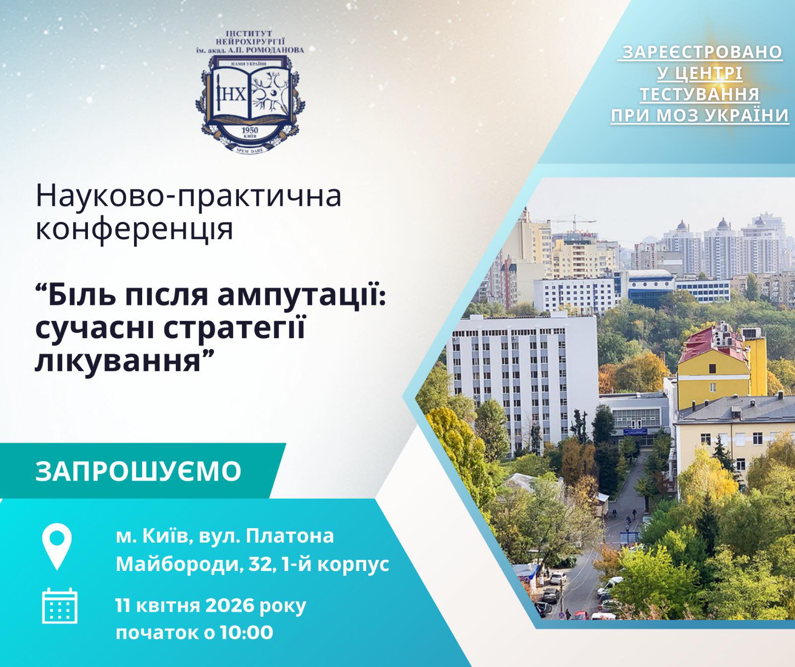 Шановні колеги! Запрошуємо взяти участь у Науково-практичній конференції «Біль після ампутації: сучасні стратегії лікування» Дата: 11 квітня 2026 року Основні питання, які розглядатимуться: Запрошуємо лікарів і фахівців суміжних напрямів на конференцію, де говоритимемо про доказові та практичні рішення — від механізмів болю до високотехнологічних методів лікування. Програма формується — незабаром опублікуємо деталі. Слідкуйте за оголошенням реєстрації! Реєстрація буде безкоштовною, а учасники отримають бали БПР. |
